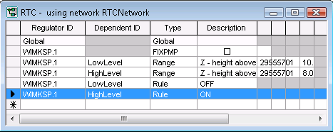 The RTC Grid Editor is used to edit Real Time Control components of regulator structures, such as pumps, sluice gates and weirs in the network. The grid can be used as an alternative to editing the RTC components in the RTC Window Editor.