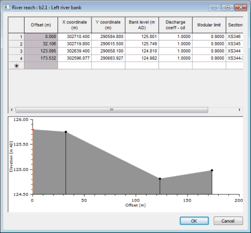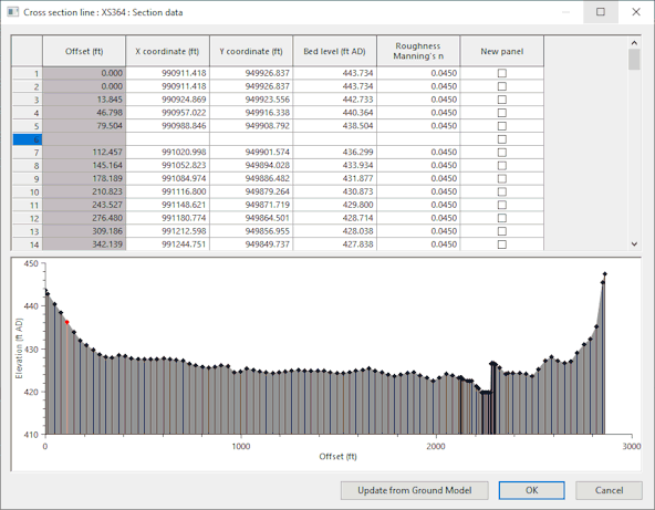 - Discharge Coefficient and Modular Limit values for bank lines are taken from the row clicked on. Roughness values for cross section lines are taken from the row clicked on, unless the row clicked on denotes a new panel and is not the first row in the grid, in which case the Roughness value is taken from the previous row.