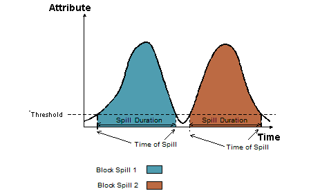 Sum of the time between the overall first and last times of spillage (threshold exceeded) within all the block spillages. Note that this is usually a larger value than the Total duration of exceedances as that corresponds to the total spillage time (i.e. sum of all durations where the threshold is exceeded) within all the spill blocks. |