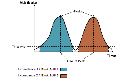 Peak is the maximum value during the exceedance or maximum flow during the block spillage. Time of peak is the time at which the exceedance maximum or block spillage maximum occurs.