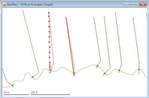 Two cross section lines that intersect the same river reach link (shown in red) are selected on the GeoPlan. The intermediate points and vertices are highlighted on the left line.