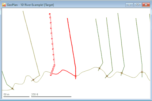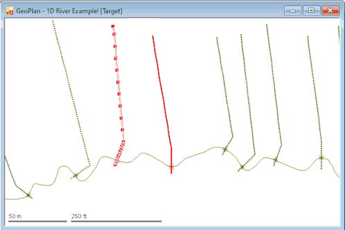 Lines, which are selected on the GeoPlan, can be straightened between their start and end points. If one or more links are also selected, the selected lines can be straightened perpendicular to the selected links. This can be particularity useful when, for example, working with survey data where cross sections need to be straightened relative to a river reach.