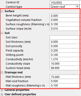 *The individual parameters which define each part of a green roof are described in the SUDS Control Data Fields and LID Control Data Fields (SWMM).