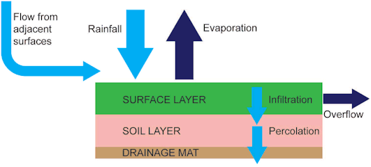 Rains garden are similar to a bio-retention cells but without a gravel bed (storage layer). They typically have a small shallow depression (about 100 mm to 300 mm deep) which is designed to overflow into a piped drainage system. Beneath this, flow can percolate through to the underlying soil.