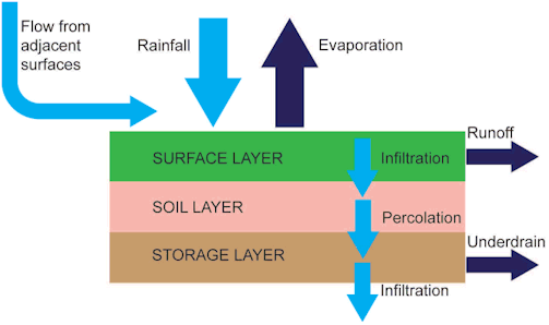 *The individual parameters which describe each part of a rain garden are described in the SUDS Control Data Fields and LID Control Data Fields (SWMM).