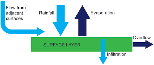 SURFACE LAYER | The ground (or pavement) surface which receives direct rainfall and flow from adjacent areas, stores flow in depression storage and generates runoff that enters the drainage system. |