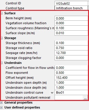 SUDS properties for an infiltration trench | LID properties for an infiltration trench |