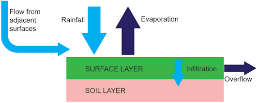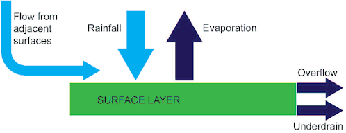 SURFACE LAYER | The ground (or pavement) surface which receives direct rainfall and flow from adjacent areas, stored flow in depression storage and generates runoff that enters the drainage system. |