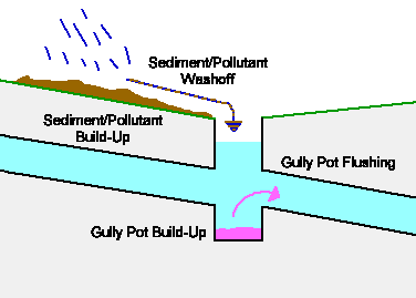 - Dissolved pollutants build up in gully pots between periods of rainfall. During a rainfall period, surface runoff entering the drainage system washes these dissolved pollutants into the network. This process is known as the Gully Pot Model.