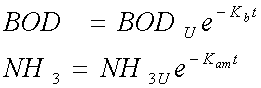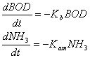 First order decay equations are used for the change in BOD and change in total ammonia: