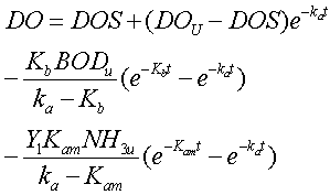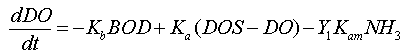 This is the Streeter\Phelps equation where: Ka is the aeration coefficient Kb is the BOD decay rate (1/days) Kam is the ammonia decay rate (1/days) Y1 is the ammonia yield factor (gO2/gN) DOS is the saturated DO concentration BOD is the BOD concentration NH3 is the total ammonia concentration Ka is given by: