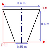 - Start at height = 0. At height = 0, width is 0.15 m, which corresponds to a factor of 0.15/0.4 = 0.375