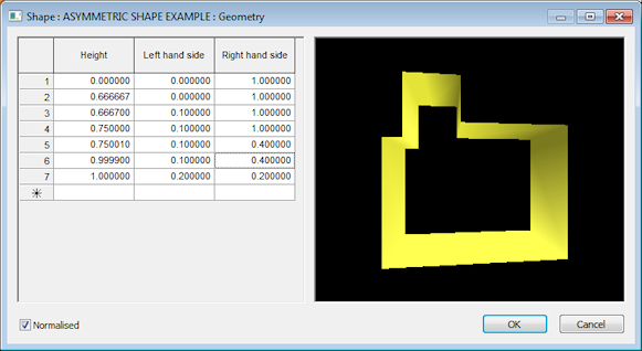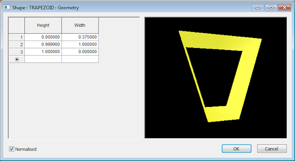 - By default, the Normalised option is checked. With this option checked, factors between 0 and 1 are entered in the geometry editor to define a normalised shape. Uncheck the Normalised option to enter actual height and width values in the editor.