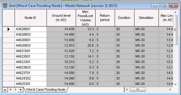 The following image shows an example of a worst case report for flood volume for nodes included in an InfoWorks simulation.
