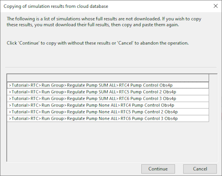 This dialog is displayed when you have checked the Copy simulation results box in the Copying of Simulation Results, Ground Models and Time Series Data dialog and the simulations you copied are from a cloud database whose results are either not downloaded or are Summary results.