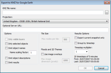 - Type in an URL in the Optional Server URL box. This allows you to export the data as a collection of .KML and .PNG files to be served to Google™ Earth as required. This is recommended for large networks as performance is significantly improved if data is accessed by Google™ Earth via a server.