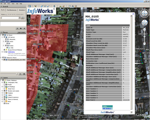 An InfoWorks ICM network can be viewed as an overlay in Google™ Earth, showing the objects' location on the aerial photography. It is possible to save the active network from the current GeoPlan Window as a KMZ file. See the Export to KMZ for Google Earth dialog topic for more details on how to create the KMZ file from within InfoWorks ICM and how to customise the export file.
