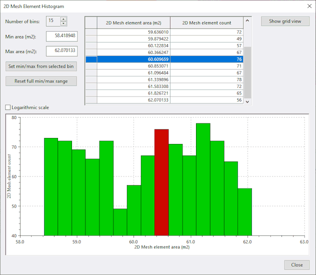 Note: There must be a non-zero value in the 2D mesh element count column in the selected row.Tip: You can use the Set min/max from selected bin button multiple times until it is no longer possible to drill down any further. The button is disabled when this occurs.