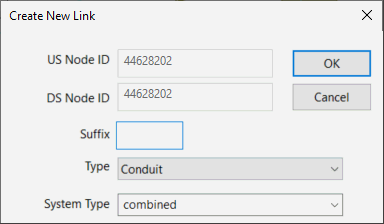 9. Select the link type and enter a suffix if necessary. If you do not enter a suffix, InfoWorks ICM will create one for you.