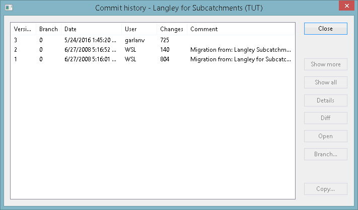 - Right-click the ‘Langley for Subcatchments (TUT)’ in the Explorer window and select Show commit history from the pop-up context menu. The Commit History dialog is then displayed.