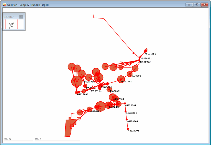 - Open the 'Langley Pruned' network in the GeoPlan. Either right-click the network in the Explorer window and select Open from the pop-up menu, or drag the network icon into the InfoWorks ICM main window.