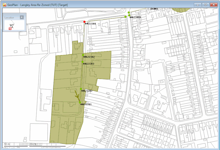- Zoom in closer, so that you can clearly see the housing estate to the south of the node '44622301'. You can, for example, use the Find in GeoPlan option in the GeoPlan menu to zoom to the node. In the dialog, enter the node id, in this case, 44622301, and click the Find button, and the GeoPlan will be centred on the specified node.