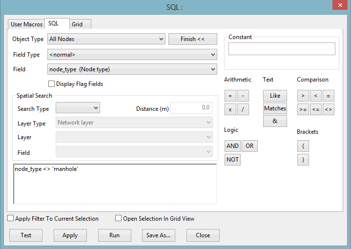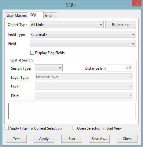 Various methods of selecting network objects have been described previously in this tutorial. However, selections can also be made using SQL queries, which allow you to create lists of objects that satisfy specified conditions. The conditions can be as simple or as complex as you like. For example, you can create a list of nodes of a particular type or links for which particular fields lie within specified ranges.
