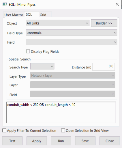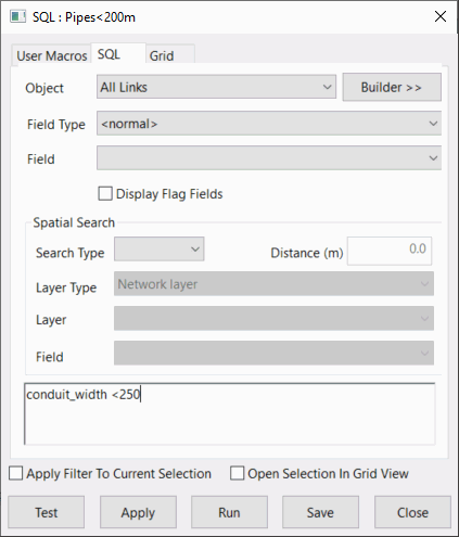 The GeoPlan tools and grids can achieve the same effects as simple SQL queries. However, more complex SQL queries can be designed to select objects according to a combination of criteria. For example, to extend the previous query to limit the search to pipes less than 250 mm wide and 10 m long: