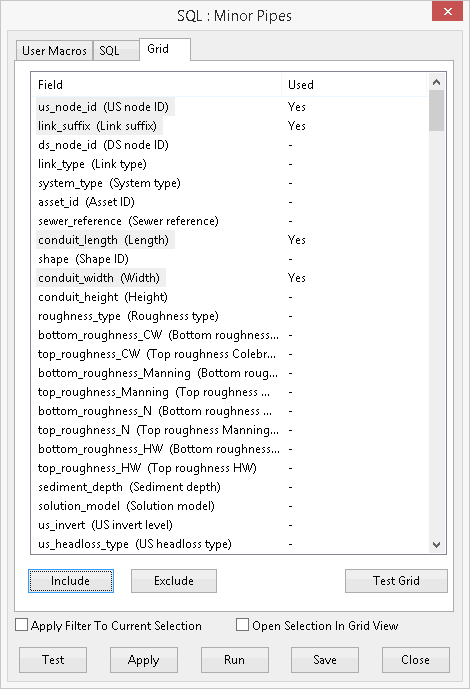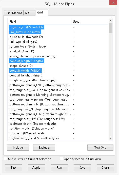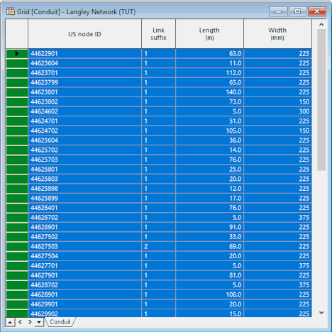 - Hold down Ctrl and click the 'us_node_id (US node ID)', 'link_suffix (Link suffix)', 'conduit_length Llength)' and 'conduit_width (Width)' fields.