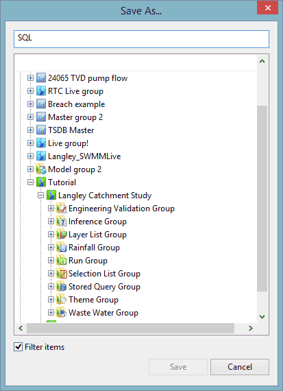 - Save the query as 'Pipes < 250 mm'. Change the default name 'SQL'' to 'Pipes < 250 m'. Open the 'Tutorial' and 'Langley Catchment Study'' items from the tree. Click the 'Stored Query Group'. Click, Save to, to add the query to the group.