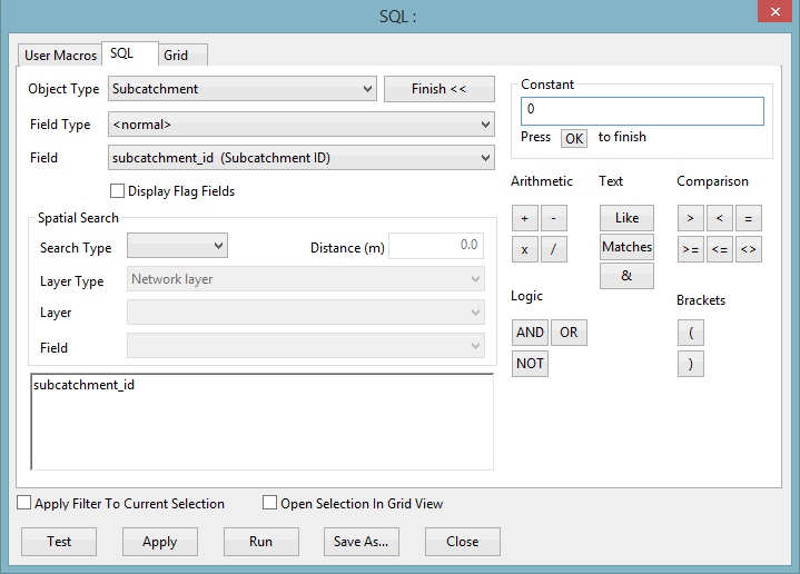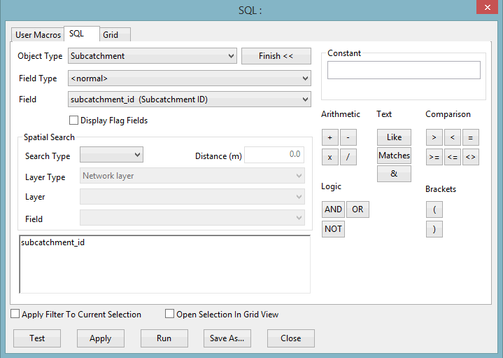 - Select the Subcatchment option from the drop-down list in the Object Type field. A simple query can select objects of one type only but remember that you can combine lists if more than one type is needed. More complex queries can also be used to select objects of more than one type.