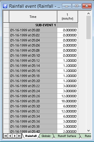 - When you have finished viewing the data, close the Rainfall Event window by clicking the