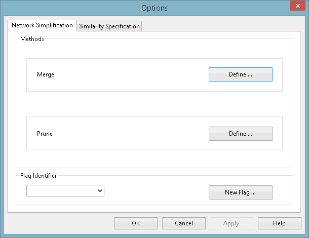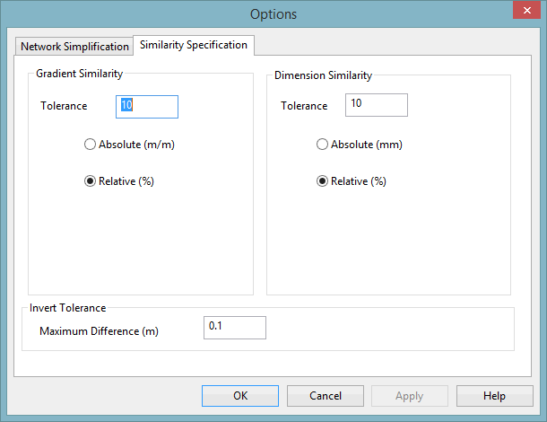 Simplification Options dialog, click the Similarity Specification tab. The tab shows the rules that will be applied when attempting to merge pipes.