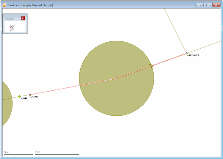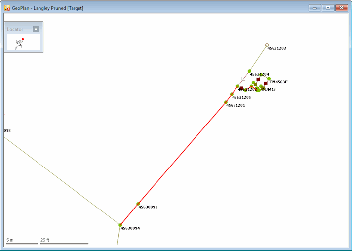 The Select similar links tool only checks as far as the next junction in each direction (hence the message about not being able to cascade upstream); you cannot merge through a junction. - Click OK to clear the dialog, and the selected link is highlighted on the GeoPlan.