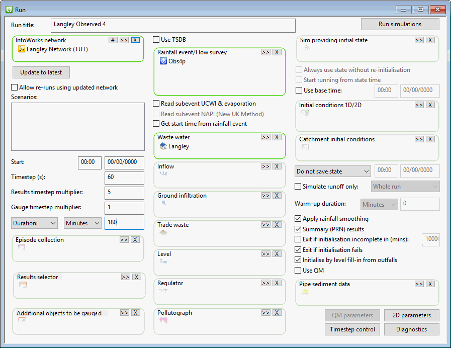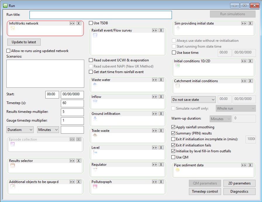 You must start the simulation or 'run' by creating a group. The run group can contain one or more runs, each of which contains the data needed to set up the InfoWorks ICM simulation engine.