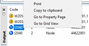 Right-click an error or warning and select Go to Grid View or Go to Property Page from the pop-up menu to display the appropriate grid view or property sheet field.