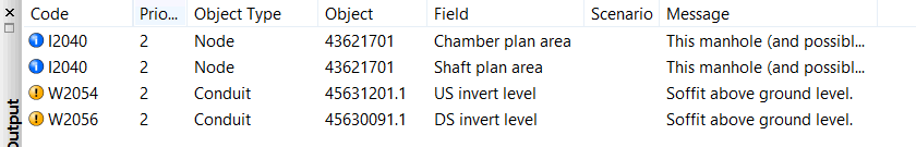 Opening the relevant grid or the property sheet for an object with a related message in the Output window