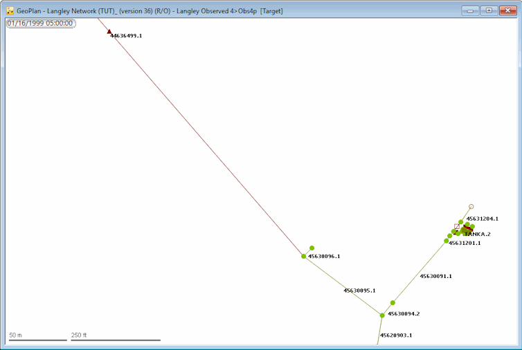 - Locate node '45630095' on the North East side of the network (to the south of the pump) and select all the pipes leading to the outfall ('45631203') node. You can use the selection tool (
