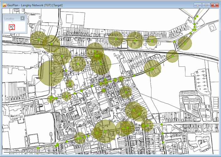 Whatever your Map Control, the GeoPlan is redrawn with detailed Ordnance Survey maps behind the network. These maps allow you to see where the network elements are in relation to features such as roads, buildings and rivers.