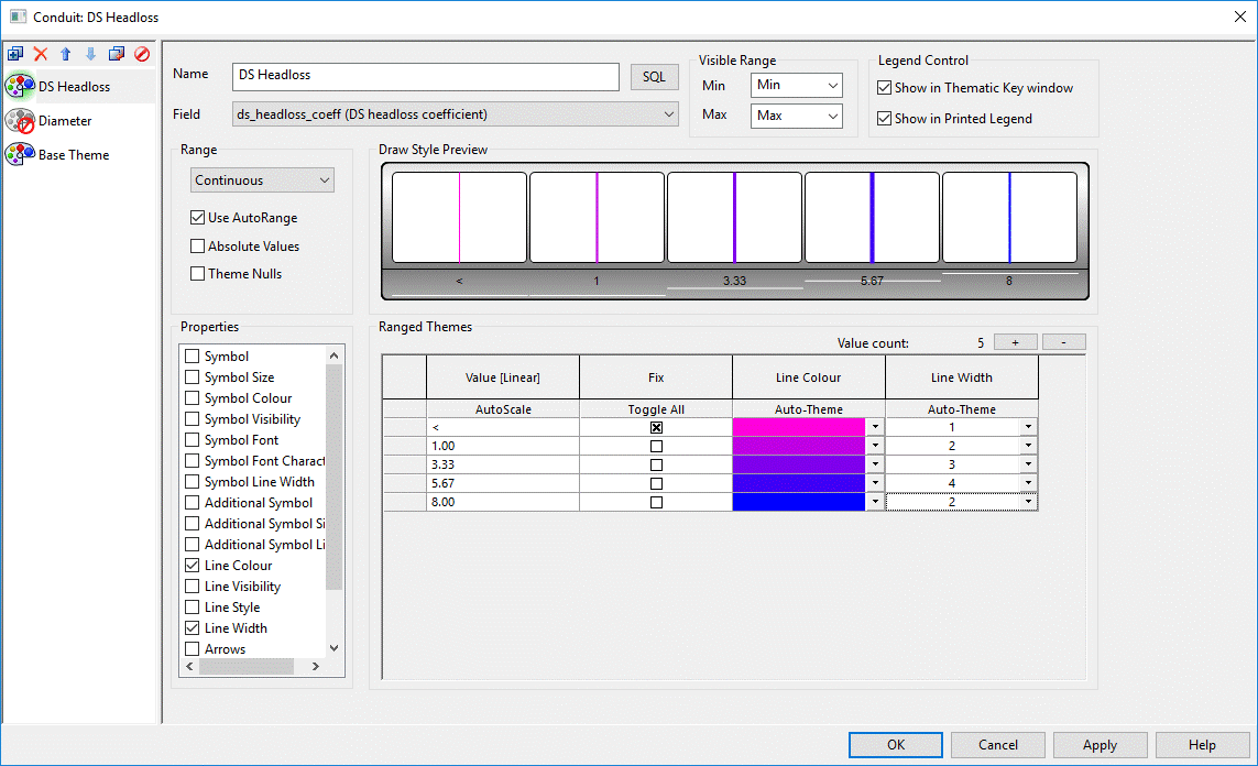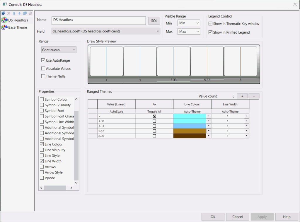 - Add a new theme, call it ‘DS Headloss’, and from the Field drop-down list, select 'ds_headloss_coeff'.