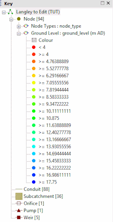 Click OK in the GeoPlan Properties and Themes window. You can now see that the lowest point in the network is in the north east, with the highest point in the west. The circle at the lowest point represents the outfall node.
