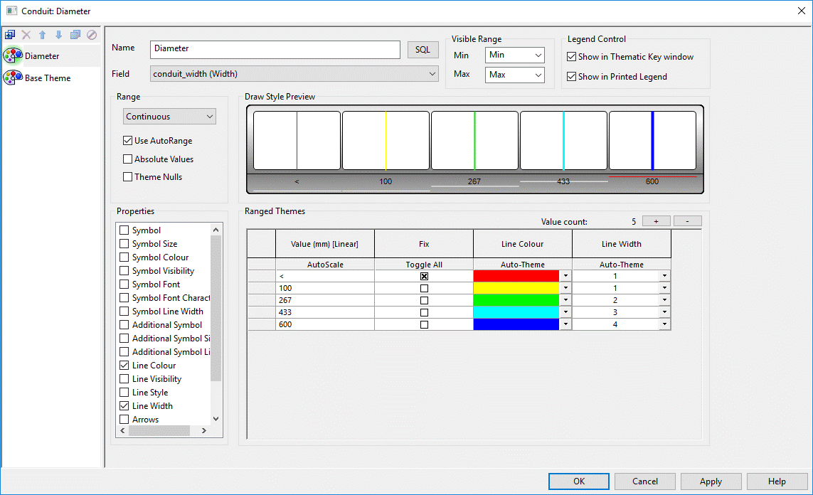 - Add a new theme, call it 'Diameter', and from the Field drop-down list, select 'conduit_width'.