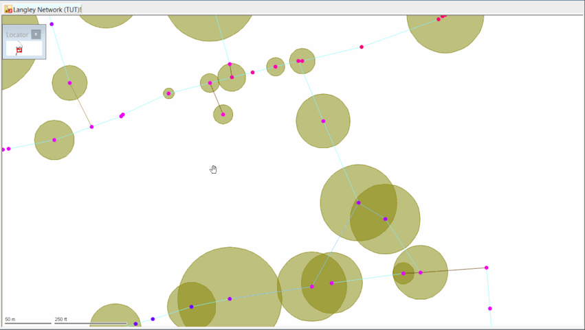 - Use the GeoPlan tools to zoom in on part of the network, and you should see that the different pipe thicknesses are now represented in the selected colours.