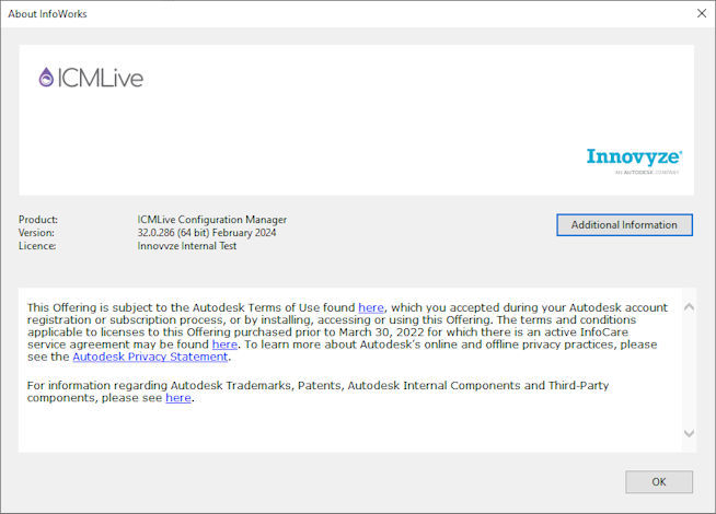 An example of the About InfoWorks box when using ICMLive Configuration Manager with an Innovyze licence: