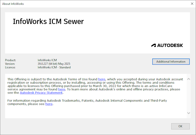 An example of the About InfoWorks box when using InfoWorks ICM Sewer with an Autodesk Standard licence: