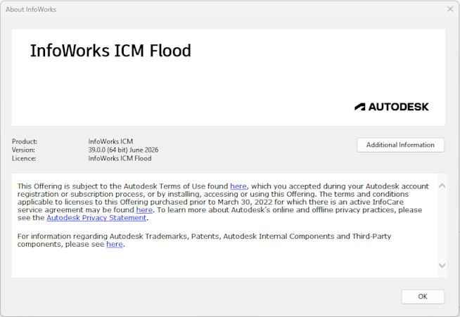 An example of the About InfoWorks box when using InfoWorks ICM Flood with an Autodesk Flood licence: