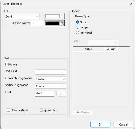 Text associated with layer objects can be displayed by checking the Active box. Edit the text appearance using the dropdown boxes. Check the Draw Features box to make layer objects visible. Check the Spline text box to display text at the orientation saved in the layer file (text will displayed horizontally if this box is unchecked). |
