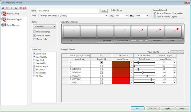 - Speed - This theme should use the fill colour and visibility of 2D triangles as indicators of speed within the triangles. Set the Field to 2DTriangle.sim.speed2d so that it is mapped to speed during replays of a simulation. You can auto-theme (i.e. set the lowest and highest values and the intermediate values will be interpolated) the fill colour and visibility.