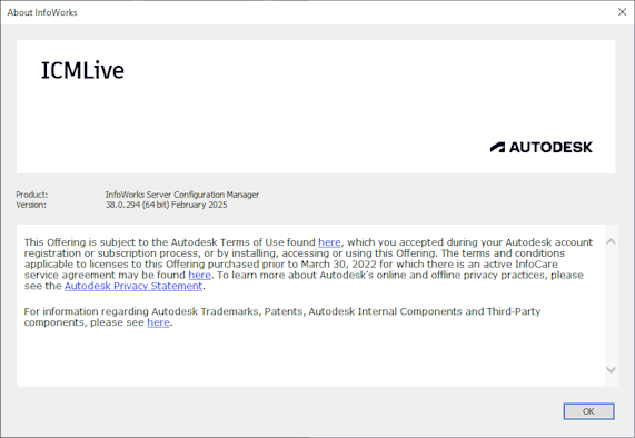 Example of the About InfoWorks when using the Autodesk version of InfoWorks Server Configuration Manager