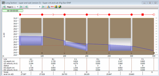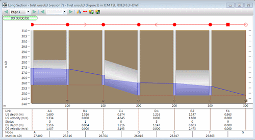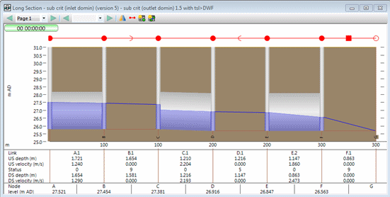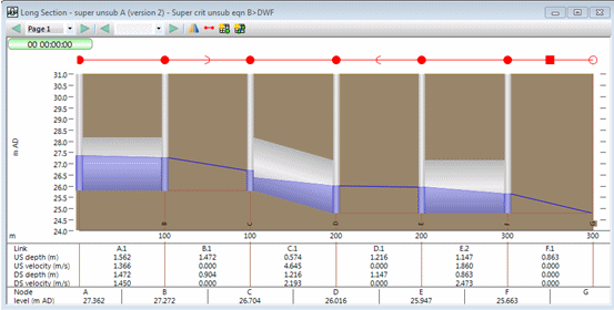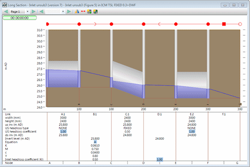 The results in Figure 3 show that the depth at the upstream end of the culvert (link C.1) is 0.574 m. The culvert invert level is 25.80 m. Therefore the water level at the upstream end of the culvert = 26.374 m. From Figure 3 it can also be seen that the water level in the manhole immediately upstream of the culvert (node C) is 26.704. Therefore the headloss calculated by InfoWorks is 26.704 – 26.374 = 0.330 m.